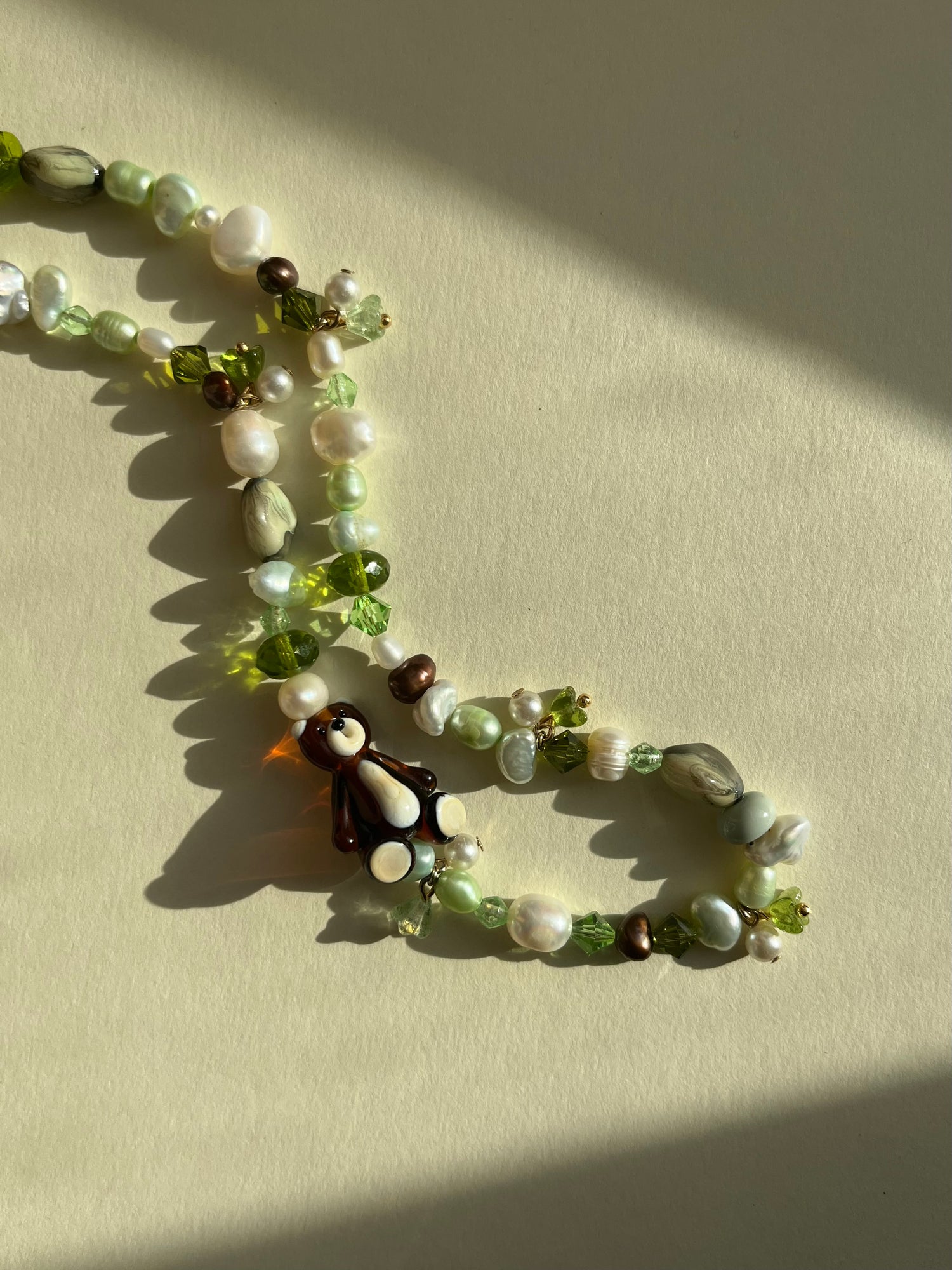 An illusion take on the classic pearl necklace. Each is unique and handmade to order, so the size and position of pearls will vary.